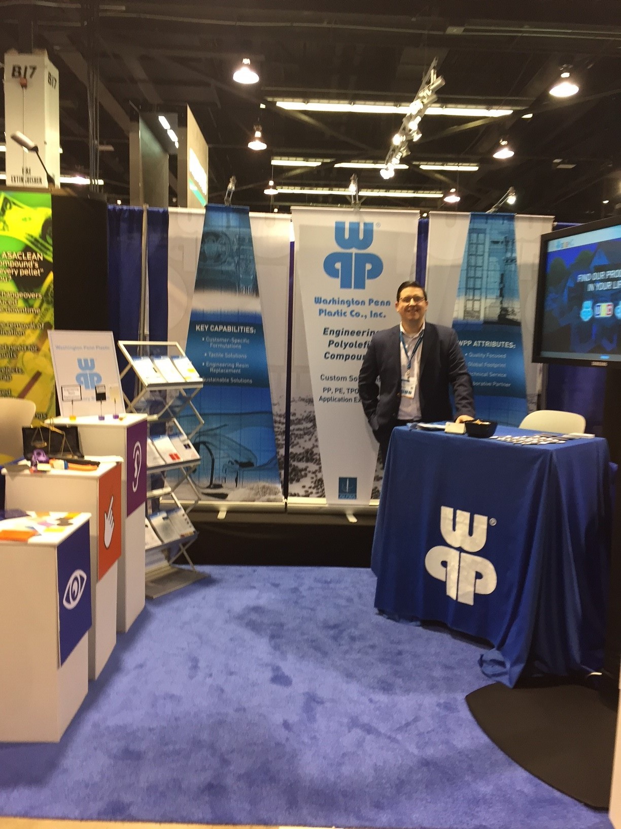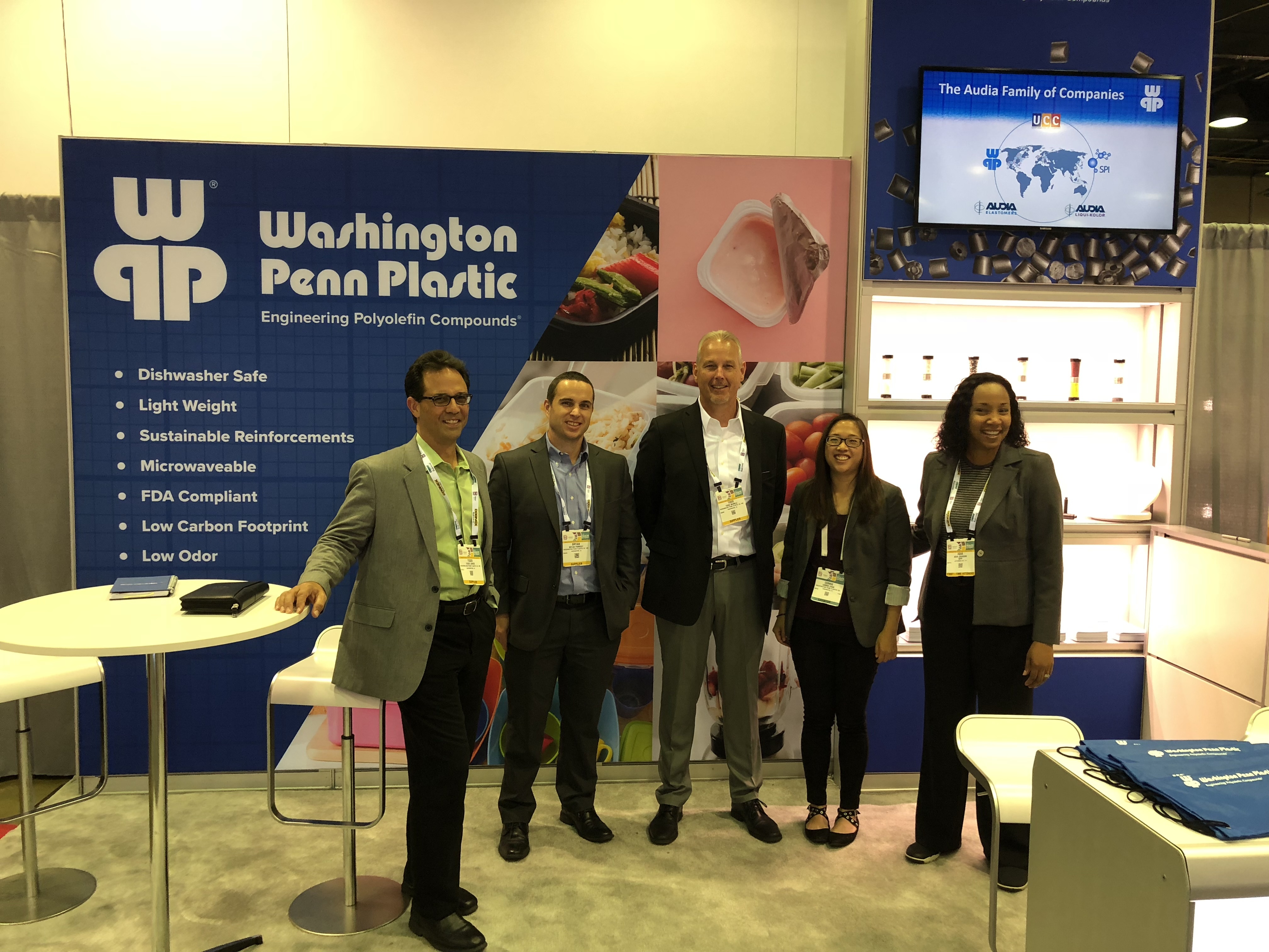 At the NPE 2018 Plastics Show, attendees had a chance to stop by our room to learn about the various customized solutions Washington Penn, Audia Elastomers, Audia Liqui-Kolor™ Solutions, Southern Polymer, Inc, and Uniform Color Company offered. WPP highlighted key innovation including soft touch PP Pro-Touch, light weighting solutions, antimicrobial technology, non-halogenated flame retardant technology, scratch & Mar technology, blush reduction solutions, and more! Our attendees also had a chance to find our products located around the main exhibit hall with Absolute Haitian, CBW Automation, Krauss-Maffei, Milacron, and Wittmann-Battenfeld, Inc.